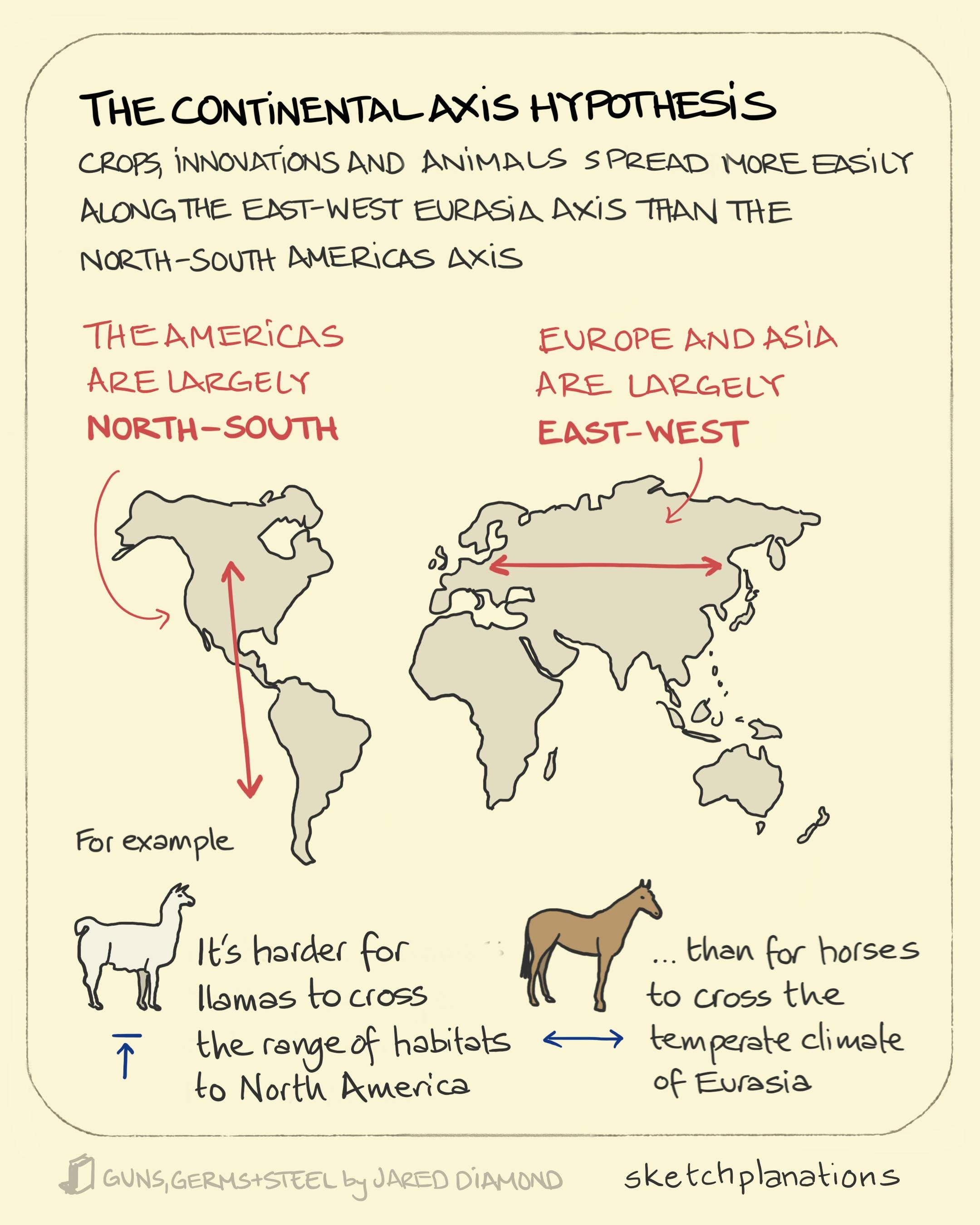 Geographical luck likely shaped world history. In Guns, Germs and Steel, Jared Diamond argues that the reason ‘Western’ powers have come to dominate the world is geographical luck, compounded over time. This applies in two ways. The first is that there were simply more species of animals and plants that could be domesticated in Europe, making it easier to practice agriculture and live in cities. Living in cities meant that people could better spread ideas and technology, as well as support larger armies. Living with animals also created immunity to diseases like smallpox, which ravaged native populations during colonisation. The second is the continental-axis hypothesis. If you look at a map, you’ll notice that the Americas and Africa are lined up North–South, while Europe and Asia are lined up East-West. It’s easier to spread societies east-west, because the climate doesn't change. This allowed Eurasian crops, animals and innovations to spread more rapidly, starting a prosperous snowball effect.