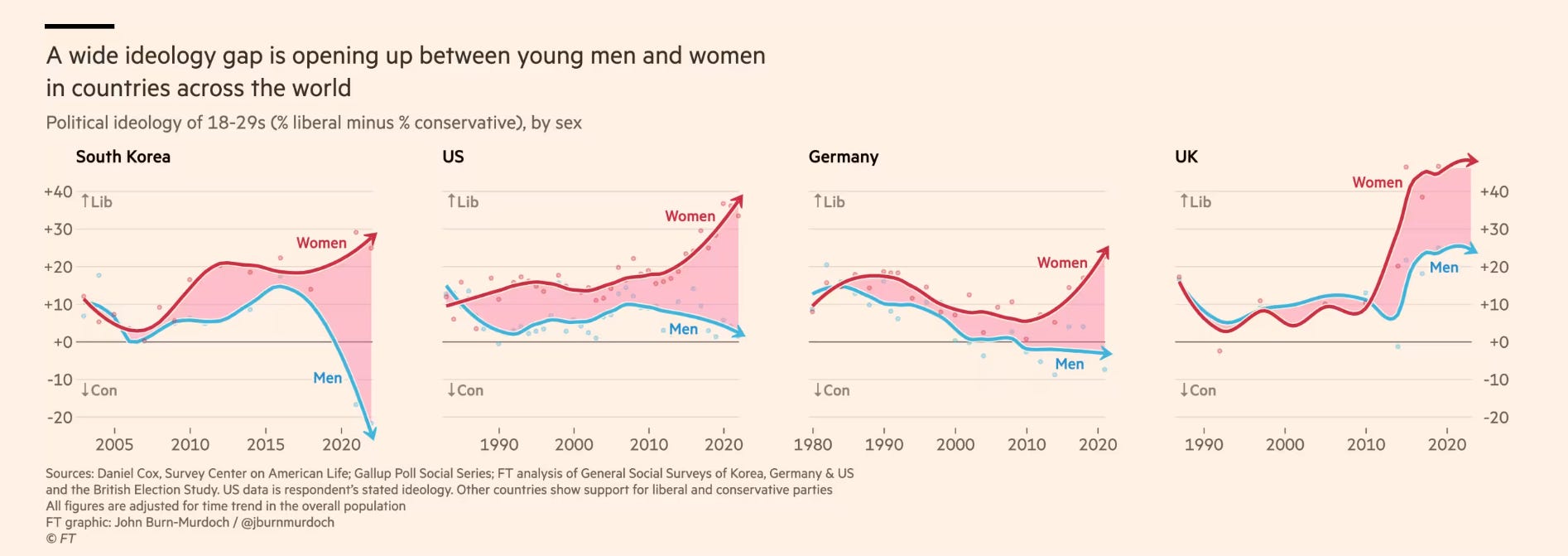 Researchers think this started with the MeToo movement, but has now progressed far beyond it. In the US, UK and Germany, young women now take far more liberal positions on immigration and racial justice than young men, while older age groups remain evenly matched.
